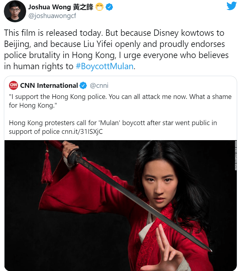 Tuttavia, nonostante l’entusiasmo che lo circonda, il film è particolarmente discusso e molte persone hanno addirittura indetto proteste per boicottarlo. Sui social media, infatti, è diventato virale l’hashtag #BoycottMulan e ciò ha acceso la curiosità di persone da tutto il mondo, che si sono chieste come mai un semplice film per bambini stia suscitando così tanto scandalo. Tali proteste sarebbero iniziate ad agosto 2019, quando la futura protagonista resa nota al pubblico, Liu Yifei, scrisse in un post sul social media cinese Weibo: “Sostengo la polizia di Hong Kong. Potete tutti attaccarmi ora”, commentando anche: “Che vergogna per Hong Kong”. In più sulla sua pagina ha citato più volte l’hashtag #IAlsoSupportTheHongKongPolice. Liu, così facendo, stava dando il suo appoggio alla forze armate di Hong Kong, accusate di violazione dei diritti umani in seguito alla spietata repressione di un gruppo di manifestanti pro-democrazia. La polizia si era scagliata violentemente contro i contestatori che protestavano per la presentazione di un emendamento, che avrebbe obbligato la regione amministrativa a consegnare alla Cina persone indagate da Pechino per determinati reati, mettendo di fatto fine all’autonomia della città asiatica. Ciò avrebbe comportato, inoltre, la violazione di diritti umani e l’uso improprio dell’estradizione per raggiungere i dissidenti politici rifugiati ad Hong Kong. Ovviamente il timore principale era che tale emendamento potesse esser utilizzato anche contro giornalisti e attivisti, che stavano solo esprimendo la propria opinione o che semplicemente stavano documentando la reale situazione cinese al mondo intero. A seguito delle infuocate proteste, il disegno di legge è stato prima sospeso e poi ritirato, ma gli scontri tra polizia e manifestanti non si sono mai fermati e anzi, sono diventati ancora più organizzati e violenti. Il fatto che stride maggiormente è che l’attrice che interpreta Mulan, eroina simbolo dell’emancipazione femminile e del coraggio per aver sradicato una società altamente patriarcale, sia la stessa sostenitrice di un governo che mina le libertà democratiche. Il giorno dell’uscita del film su Disney +, l’attivista Joshua Wong ha pubblicato un post su Twitter dichiarando: “Questo film è uscito oggi. Ma poiché la Disney si inchina a Pechino e poiché Liu Yifei sostiene apertamente e orgogliosamente la brutalità della polizia a Hong Kong, esorto tutti coloro che credono nei diritti umani a #BoycottMulan”.