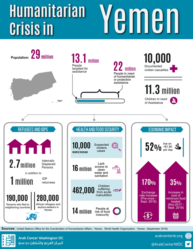 Ciò che emerge dal quadro precedentemente delineato è non solo la complessità della guerra civile yemenita, dovuta alla frammentazione interna e al coinvolgimento di diversi interessi regionali e internazionali, ma anche la gravità della crisi umanitaria che sta interessando il Paese.