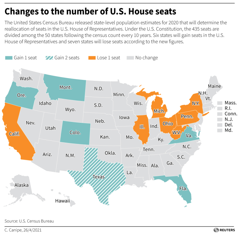 In seguito al recente censimento degli Stati Uniti, che si svolge ogni dieci anni, la divisione dei 435 seggi della Camera dei Rappresentanti e dei 538 Grandi Elettori è destinata a cambiare. Infatti, con la nuova redistribuzione demografica tra i vari Stati, saranno assegnati due seggi al Texas e uno rispettivamente a Florida, North Carolina, Colorado, Montana e Oregon. A perdere un seggio, invece, gli Stati di New York, California, Illinois, Michigan, Ohio, Pennsylvania e West Virginia. Questa riallocazione ha un importante significato politico, visto l’orientamento repubblicano di alcuni degli Stati favoriti dal nuovo census, come Texas e Florida. Ci si domanda quale sarà quindi il futuro della maggioranza democratica nella Camera dei Rappresentanti, già particolarmente ristretta, con 218 democratici e 212 repubblicani.