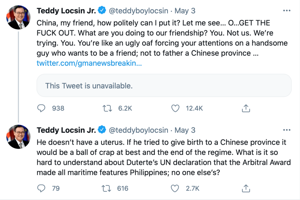 Il Ministro degli Esteri filippino, Teodoro Locsin, ha scritto in un Tweet “China, my friend, how politely can I put it? Let me see… O… GET THE F*** OUT”, riferendosi alla prolungata presenza di navi cinesi nella Zona Economica Esclusiva delle Filippine, nel Mar Cinese Meridionale. Le tensioni tra i due Paesi sono cominciate a marzo scorso, quando navi cinesi sono state avvistate per la prima volta in acque filippine. Nonostante le ripetute richieste da parte del Governo di Manila, Pechino si è rifiutata di ritirare le proprie imbarcazioni dall’area, che la Cina, nonostante il verdetto della Corte permanente di Arbitrato, che ha riconosciuto la sovranità filippina sulle acque contese, reclama come propria. Il Ministero degli Affari Esteri filippino ha, inoltre, affermato che la presenza delle navi cinesi è “una palese violazione della sovranità filippina”. In risposta, Pechino ha avvertito che la “diplomazia del megafono” portata avanti di Locsin avrebbe potuto minare le relazioni cinesi con le Filippine e la fiducia reciproca tra i due Paesi.