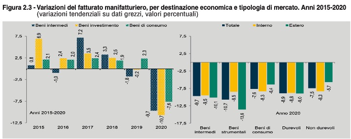 Le decisioni adottate dai governi nazionali riguardanti le chiusure della maggior parte delle attività economiche hanno sicuramente colpito l’economia globale spingendola nella peggiore recessione dai tempi della Seconda Guerra Mondiale. Il sistema manifatturiero è entrato in lockdown avendo alle spalle già due anni di recessione e l’Italia, uno dei Paesi maggiormente colpito, ha visto una perdita del PIL pari al 8,8% nel 2020 e un aumento del debito pubblico rilevante. La crisi è stata definita da uno shock che ha riguardato tanto l’offerta quanto la domanda (crollo dei consumi, disoccupazione, riduzione dei redditi). Tra i settori manifatturieri, il comparto del tessile, abbigliamento e calzature è quello che ha subito il crollo più̀ grave (-23%), seguito dai macchinari e mezzi di trasporto (-15%). L’Istat (Istituto Nazionale di Statistica) ha stilato un “Rapporto sulla competitività dei settori produttivi” molto interessante, dal quale emerge un’analisi del quadro macroeconomico e della performance dei settori manifatturieri dettagliata. Si riporta nel seguente articolo esclusivamente l’andamento a livello settoriale relativo al fatturato manifatturiero, dal quale emerge una profonda flessione dei beni strumentali e di quelli intermedi.